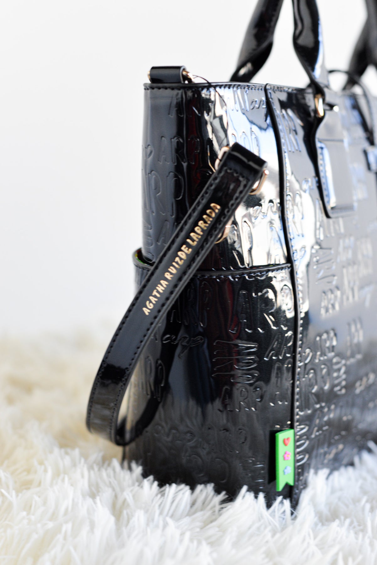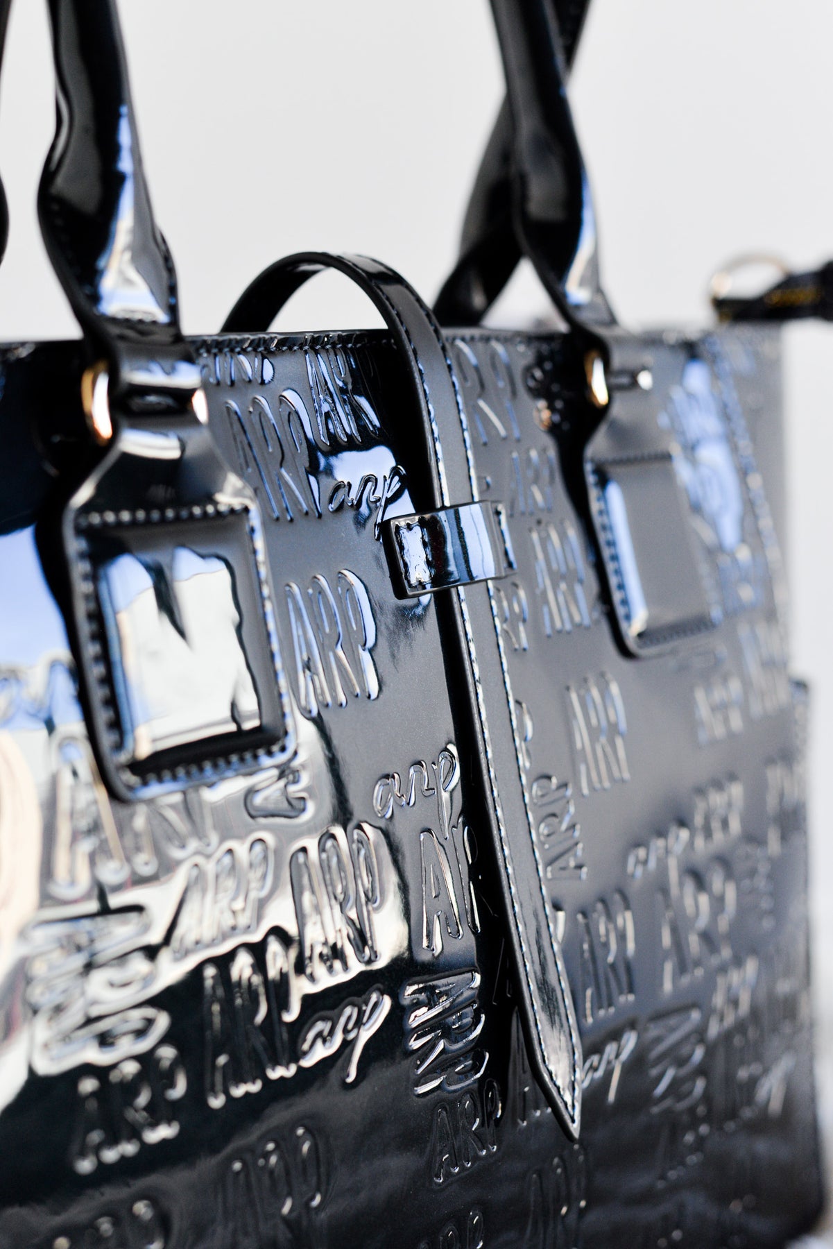Este shopper grande de charol estructurado eleva cualquier look con su acabado premium y el logo ARP grabado en distintos tamaños y tipografías, que aportan textura y sofisticación en cada detalle.