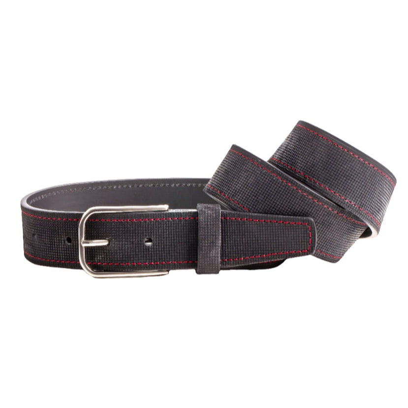 Este cinturón en piel bovina Samy de 35 mm destaca por su grabado a cuadritos pequeños, que aporta textura sofisticada y personalidad. Su pespunte en rojo añade un contraste moderno y audaz, convirtiéndolo en el complemento perfecto para looks casuales o formales.