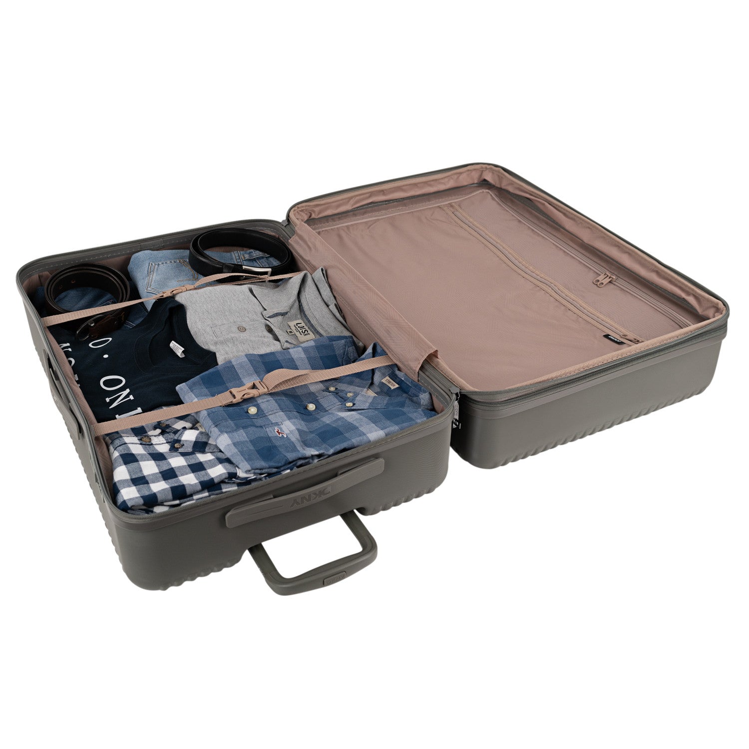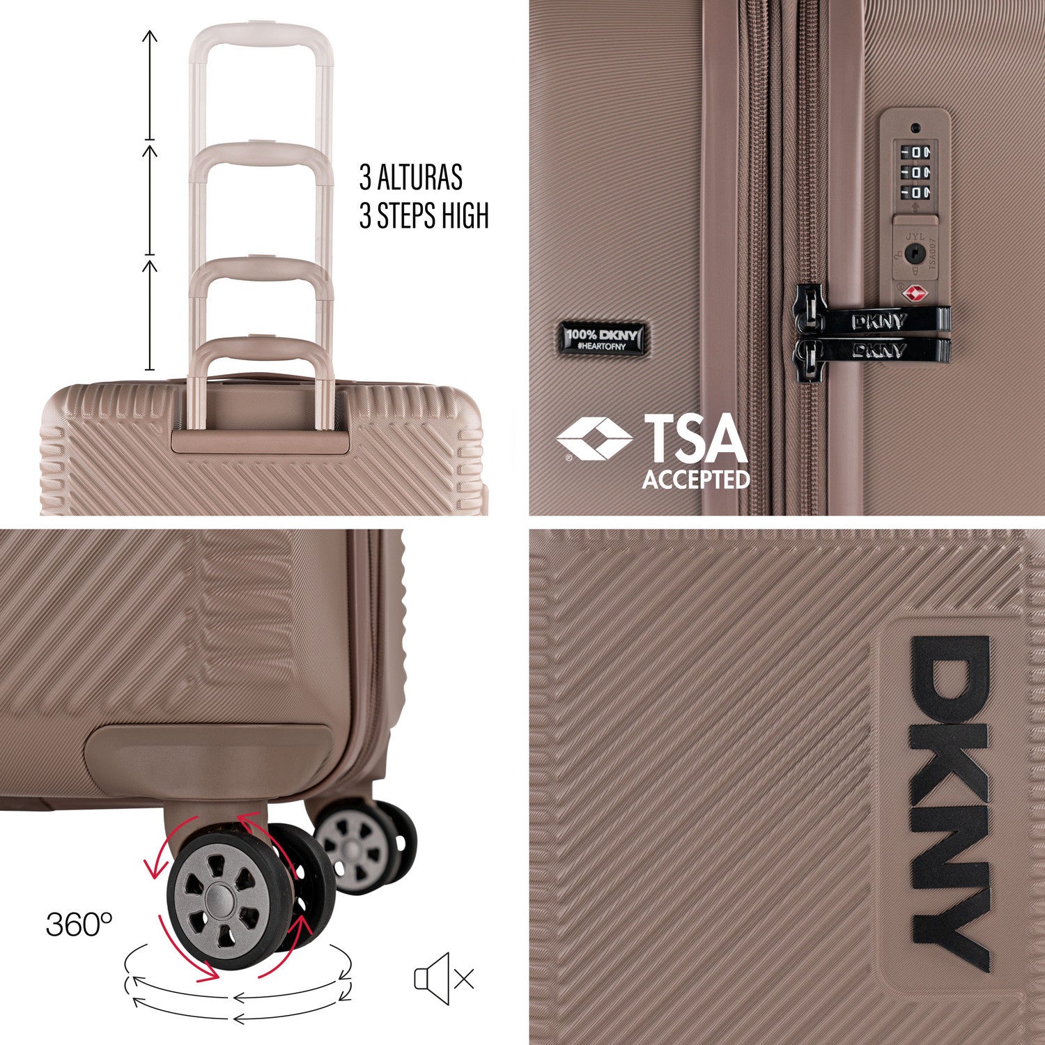 Fabricada en una resistente combinación de ABS y policarbonato, esta maleta ofrece protección ante impactos y una ligereza sorprendente para su tamaño. Su acabado con el logo DKNY en relieve y textura mate le aporta un aire elegante y distinguido, perfecto para los viajeros más exigentes.