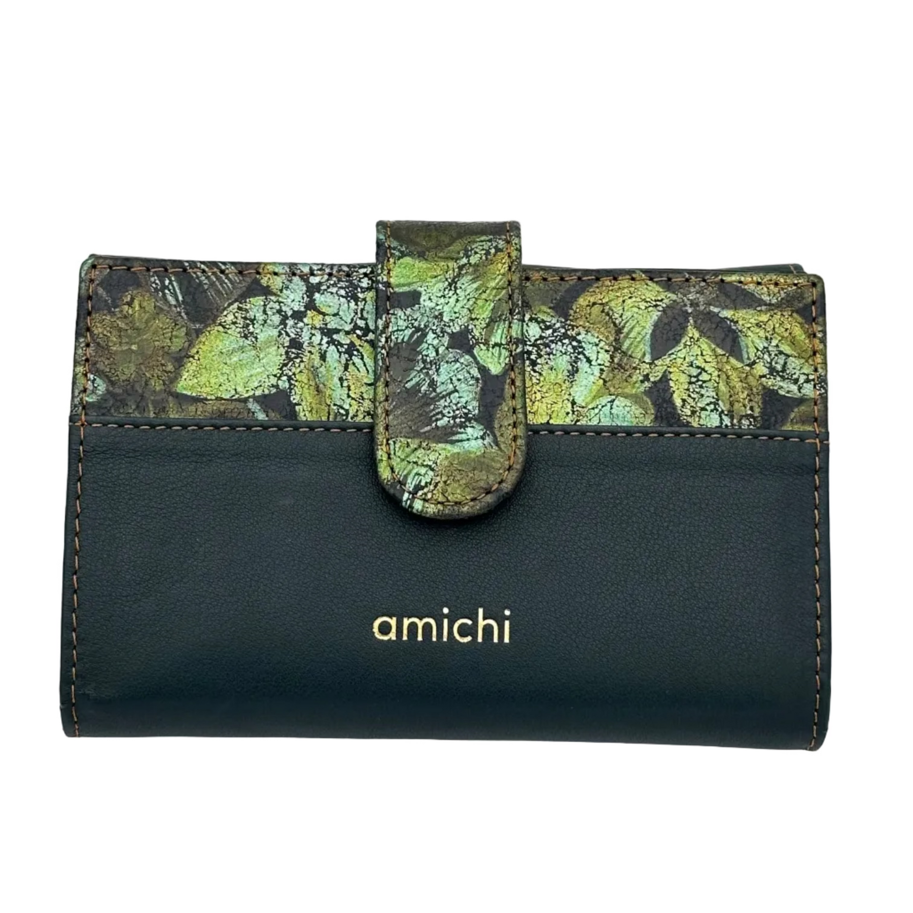 Billetero de Piel Vacuno Monedero Clic Amichi Hojas Verde 14,5x10cm