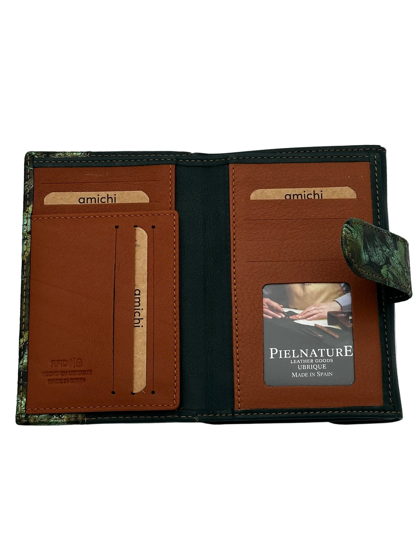 El billetero Amichi Hojas Verde es una pieza de marroquinería premium, fabricada en Ubrique (España) con piel vacuno de máxima calidad, reconocida por su resistencia, tacto suave y excelente acabado. Su diseño con estampado de hojas en tonos verdes aporta un estilo natural, elegante y atemporal, ideal para quienes buscan un billetero amplio sin renunciar al diseño.