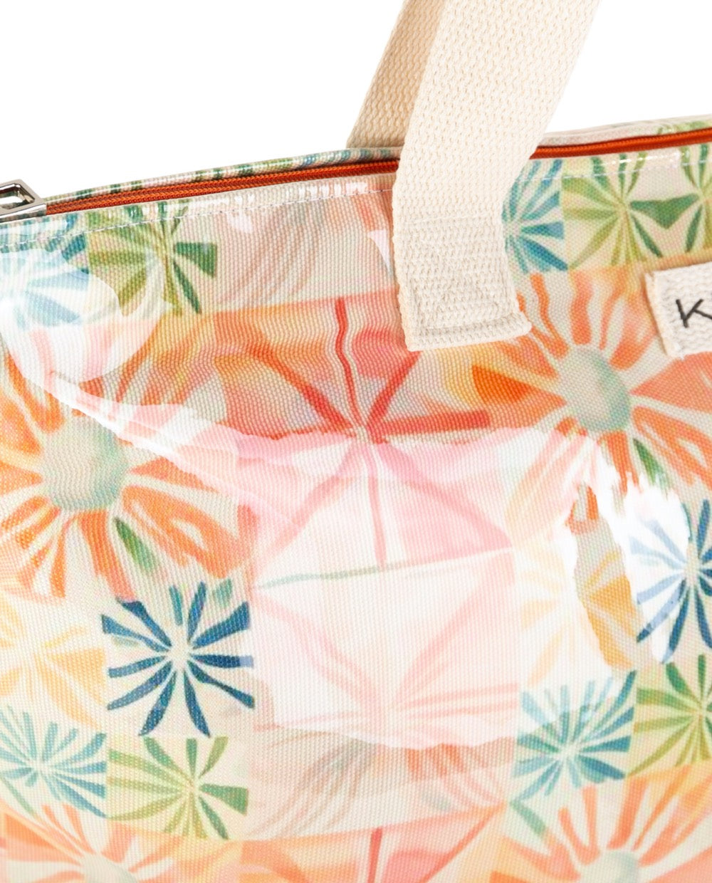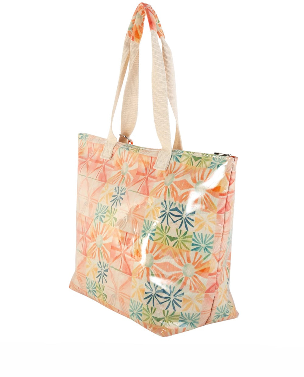 La lona plastificada aporta resistencia y protección frente a la humedad y la arena, además de un acabado brillante que intensifica el color. Las asas de algodón en tono neutro equilibran el conjunto, mientras el detalle del cordón decorativo añade ese toque desenfadado que marca la diferencia.