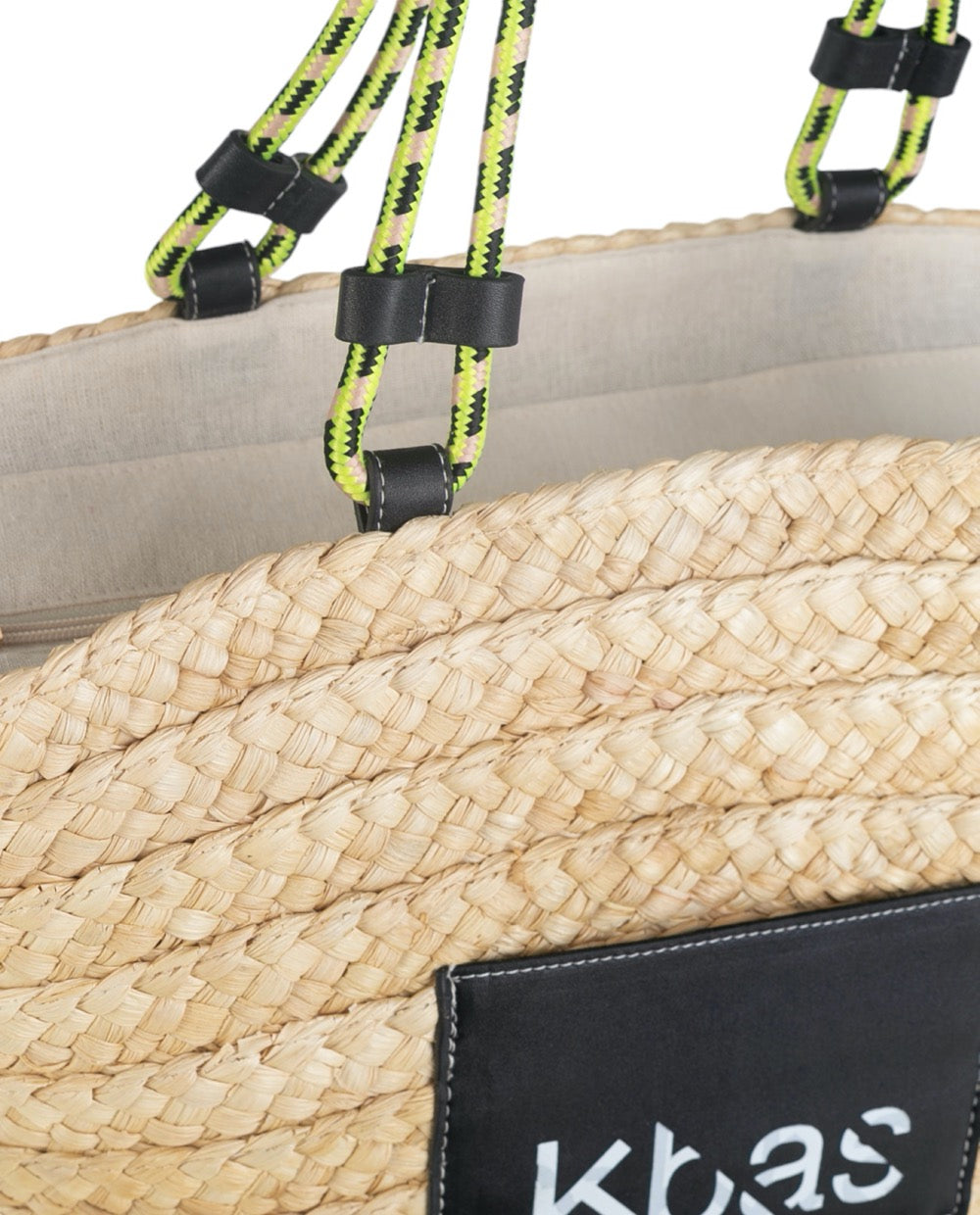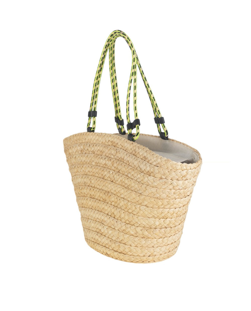 La estructura en paja de maíz trenzada mantiene la esencia mediterránea, con una silueta amplia y ligera. Pero lo que realmente cambia las reglas son sus asas tipo cuerda en amarillo flúor con detalles negros: deportivas, vibrantes, imposibles de ignorar.