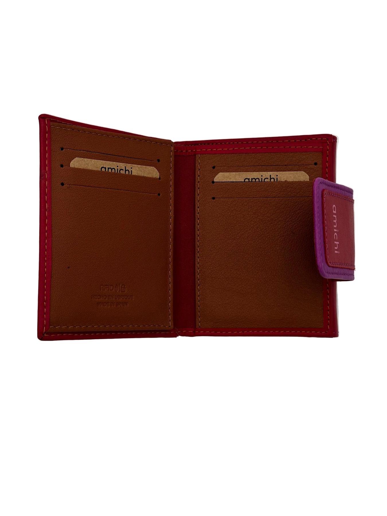 El billetero Amichi Classic 12 × 9,5 cm es una pieza de marroquinería artesanal de alta calidad, fabricada 100 % en España, respetando el medio ambiente y los procesos tradicionales.