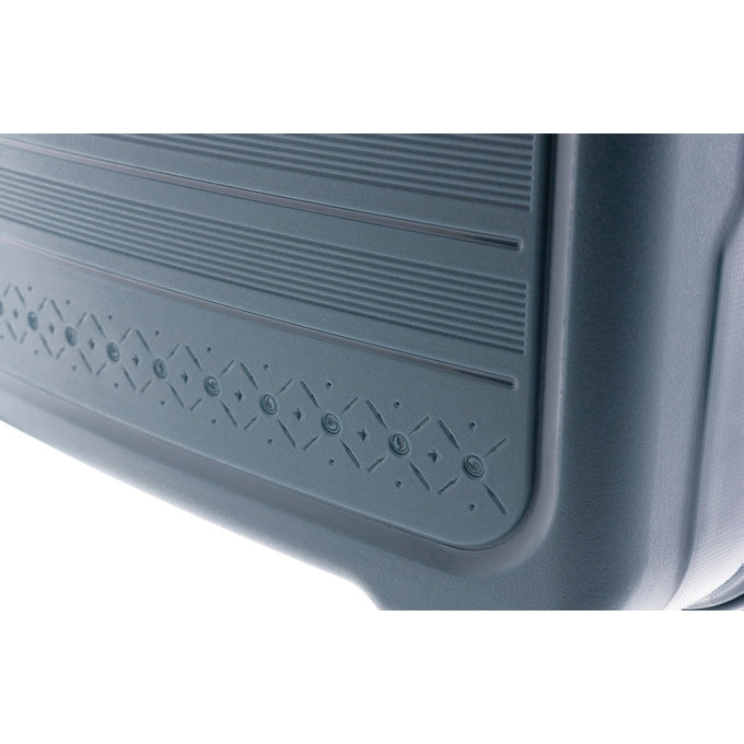Fabricada en polipropileno resistente y sostenible, incorpora un grabado distintivo de lanzas y cascos que la hace única y reconocible para el viajero moderno.