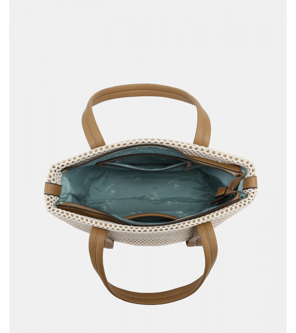 Su diseño calado efecto rejilla aporta textura, ligereza visual y un aire actual que hace que el bolso destaque sin necesidad de exagerar.