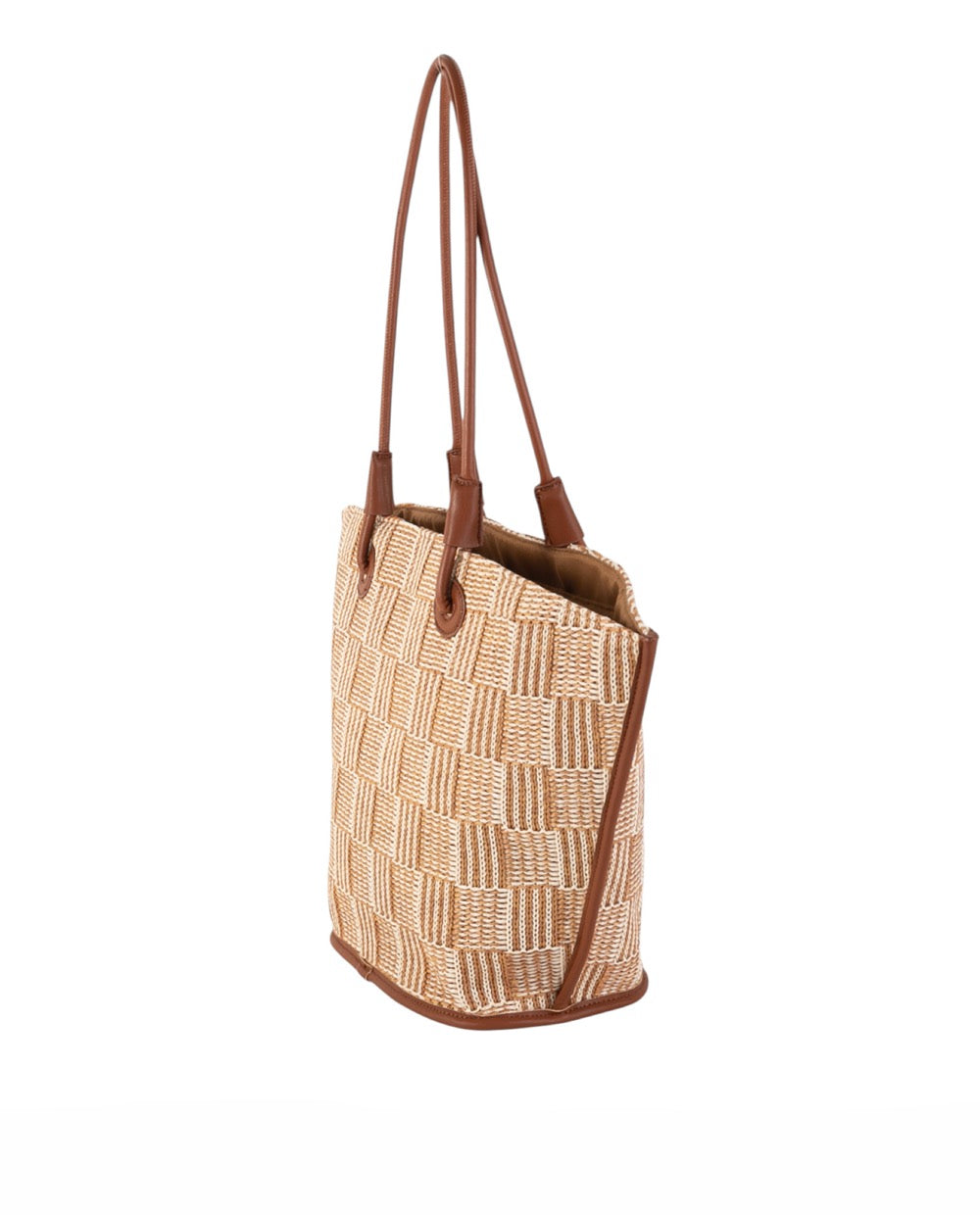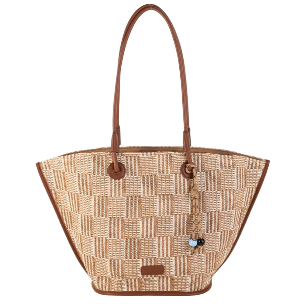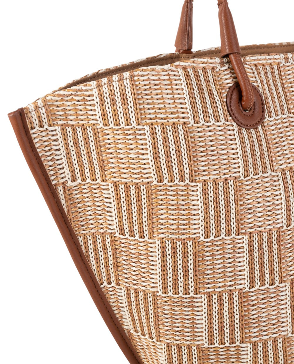 El Tote Kbas Trama Marrón convierte el clásico bolso de verano en una pieza con identidad propia. Su diseño trenzado en patrón cuadriculado crea un efecto visual estructurado, casi arquitectónico, que combina fibras en tonos naturales y blancos para aportar profundidad y contraste.