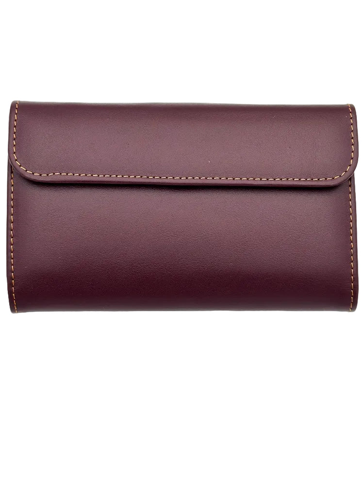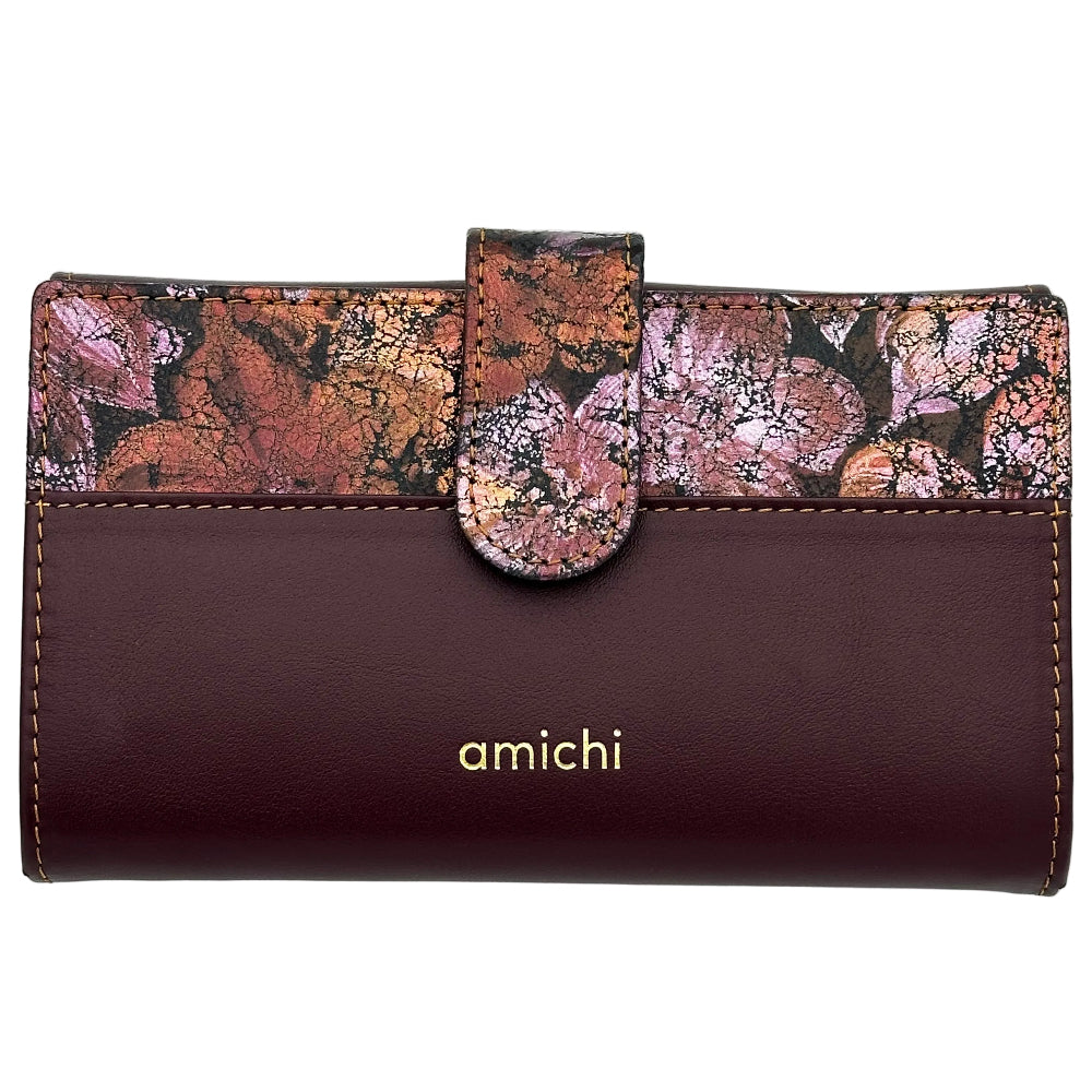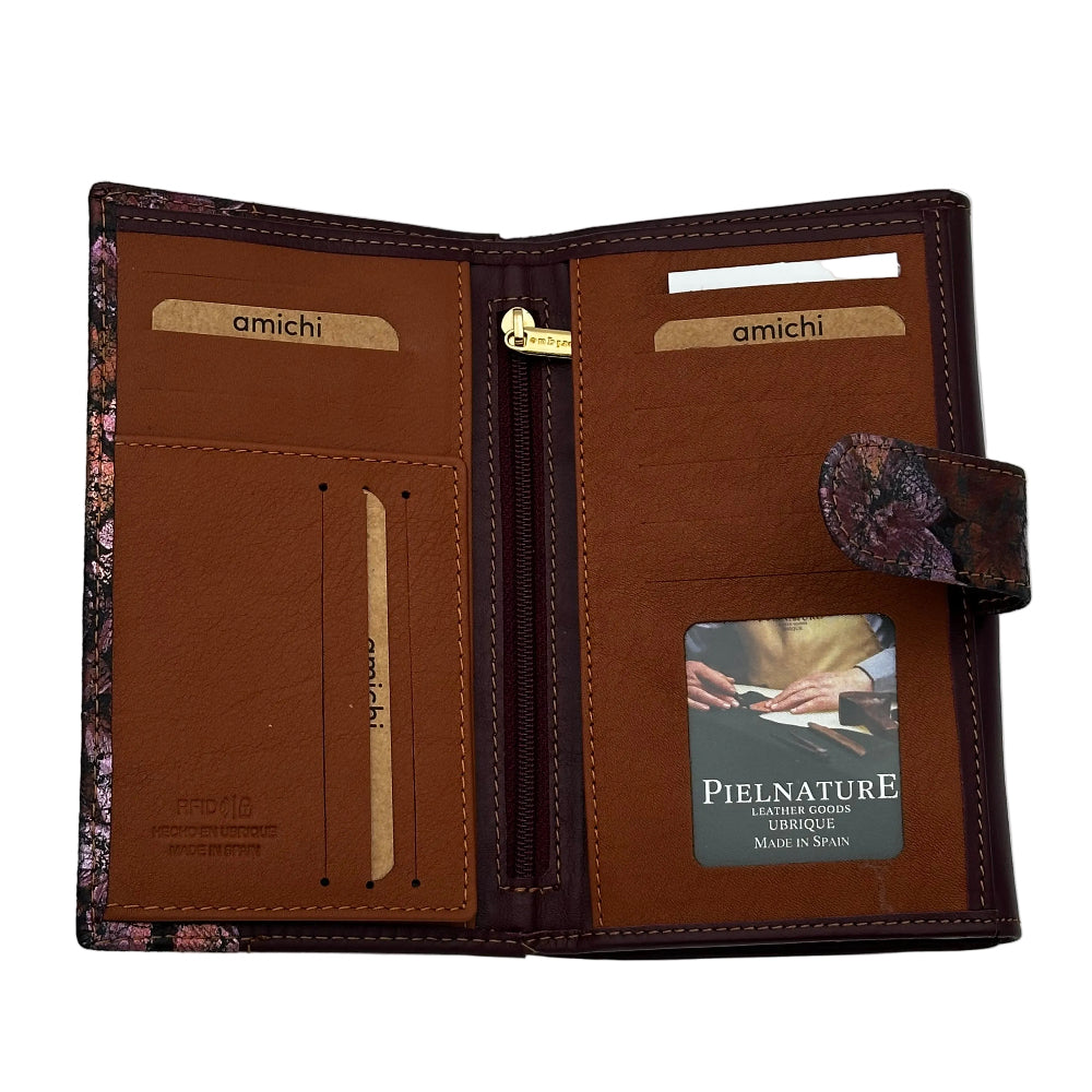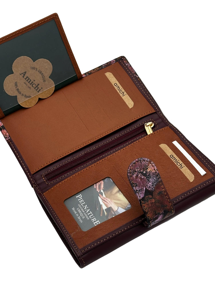Billetero de Piel Vacuno Monedero Clic Amichi Hojas Burdeos 16,5x10cm