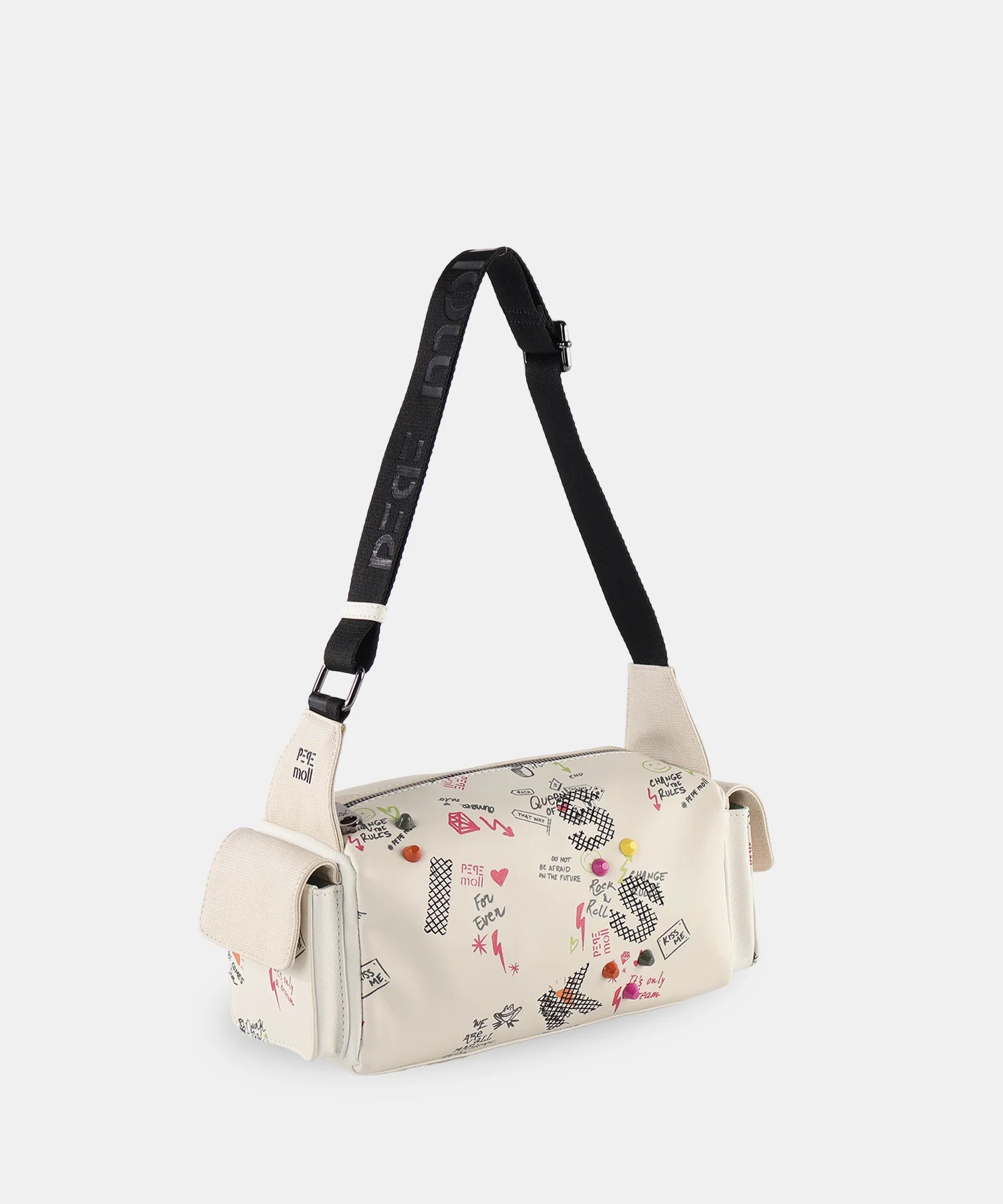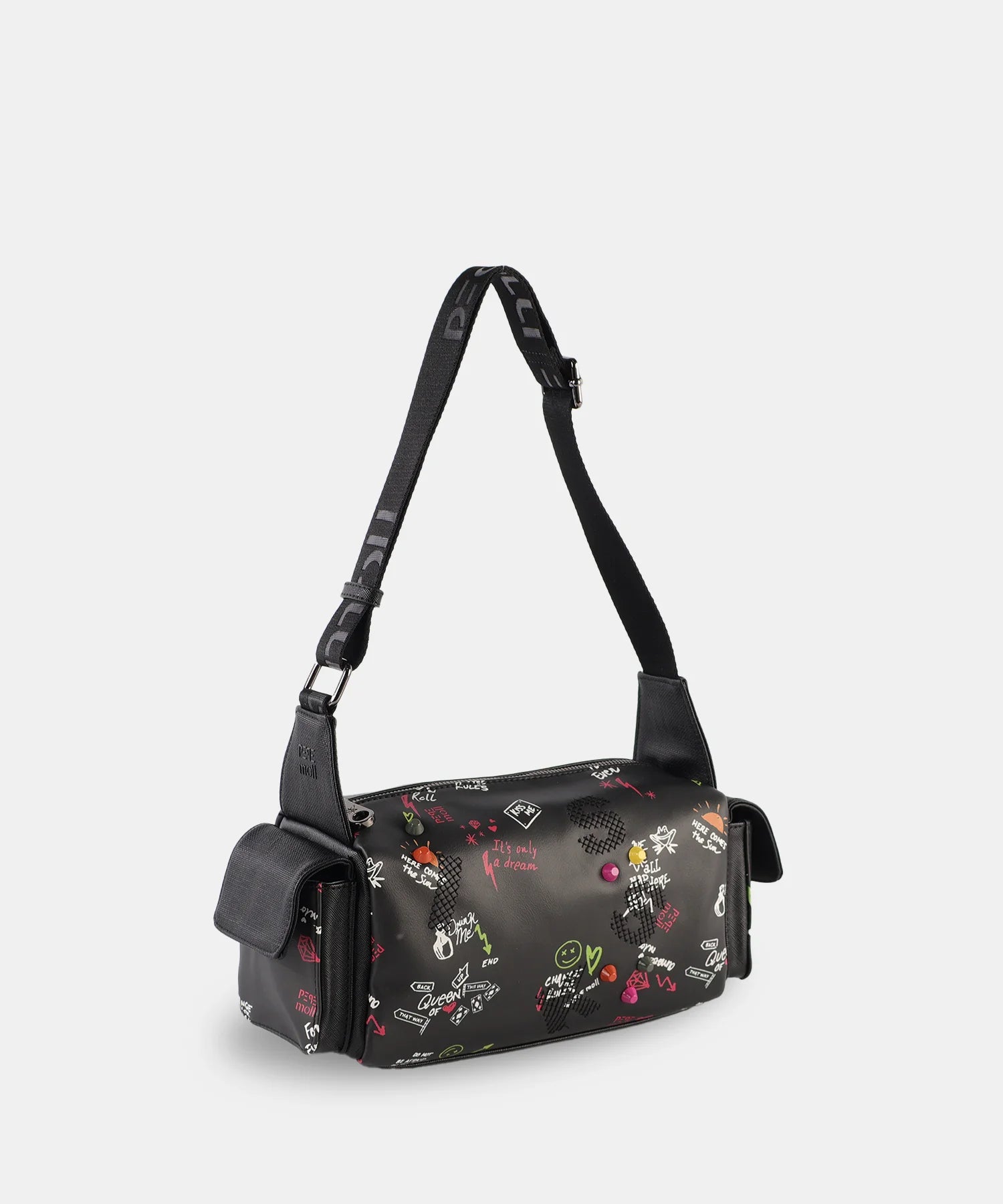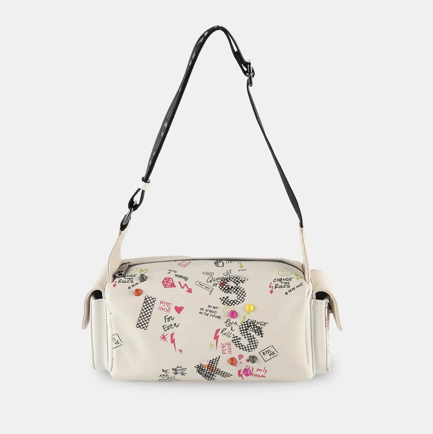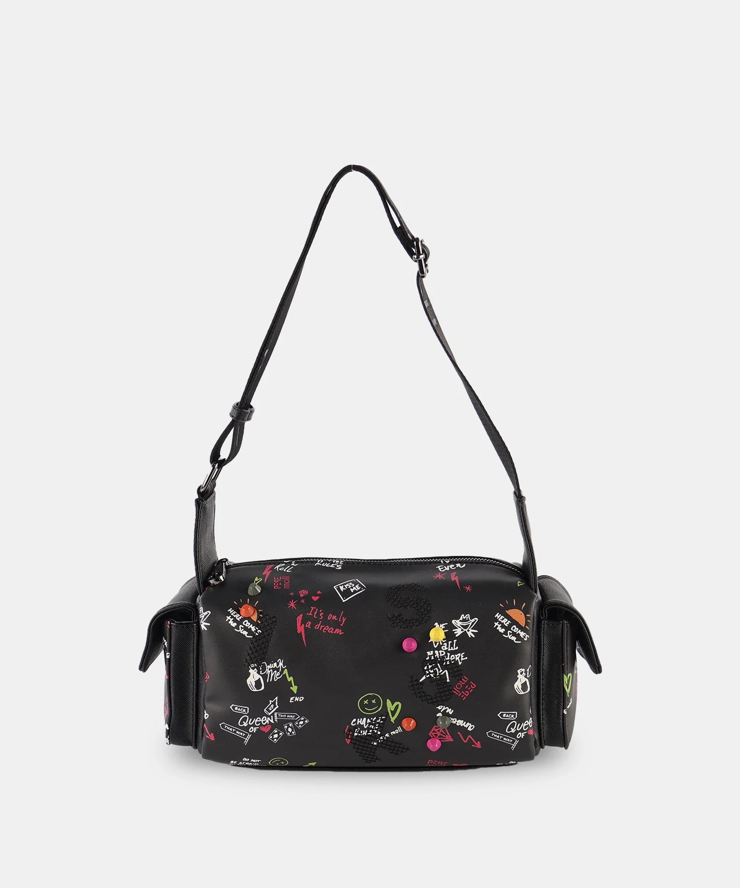 Su silueta tipo baguette, alargada y estructurada, crea un look moderno y urbano. Y su mezcla de gráficos, mensajes y detalles convierte cada lado del bolso en una declaración de estilo.