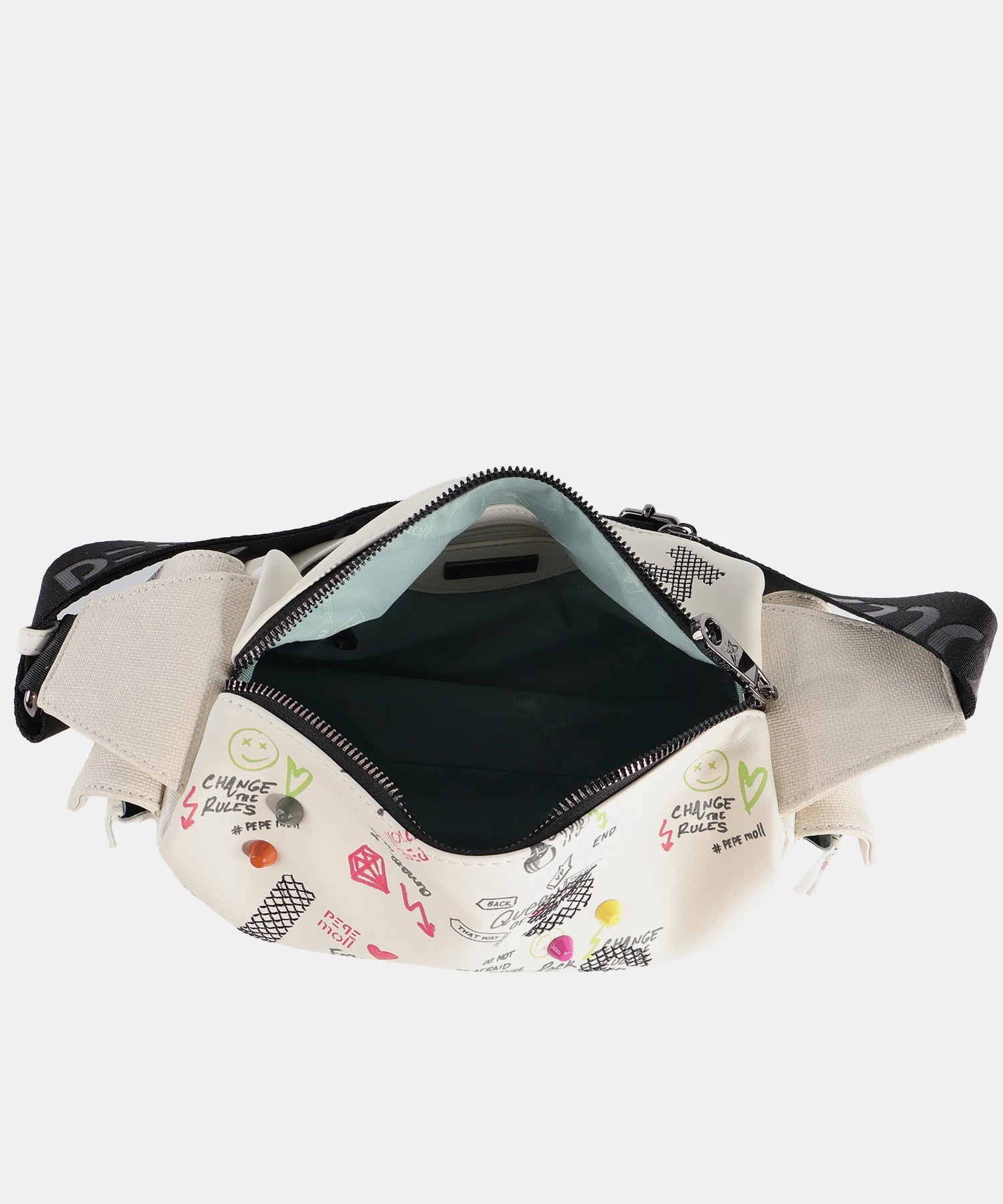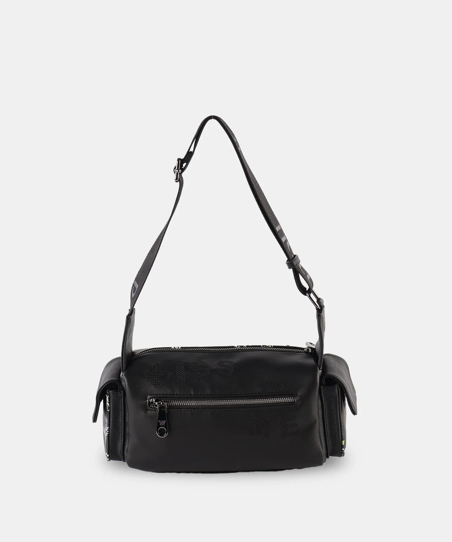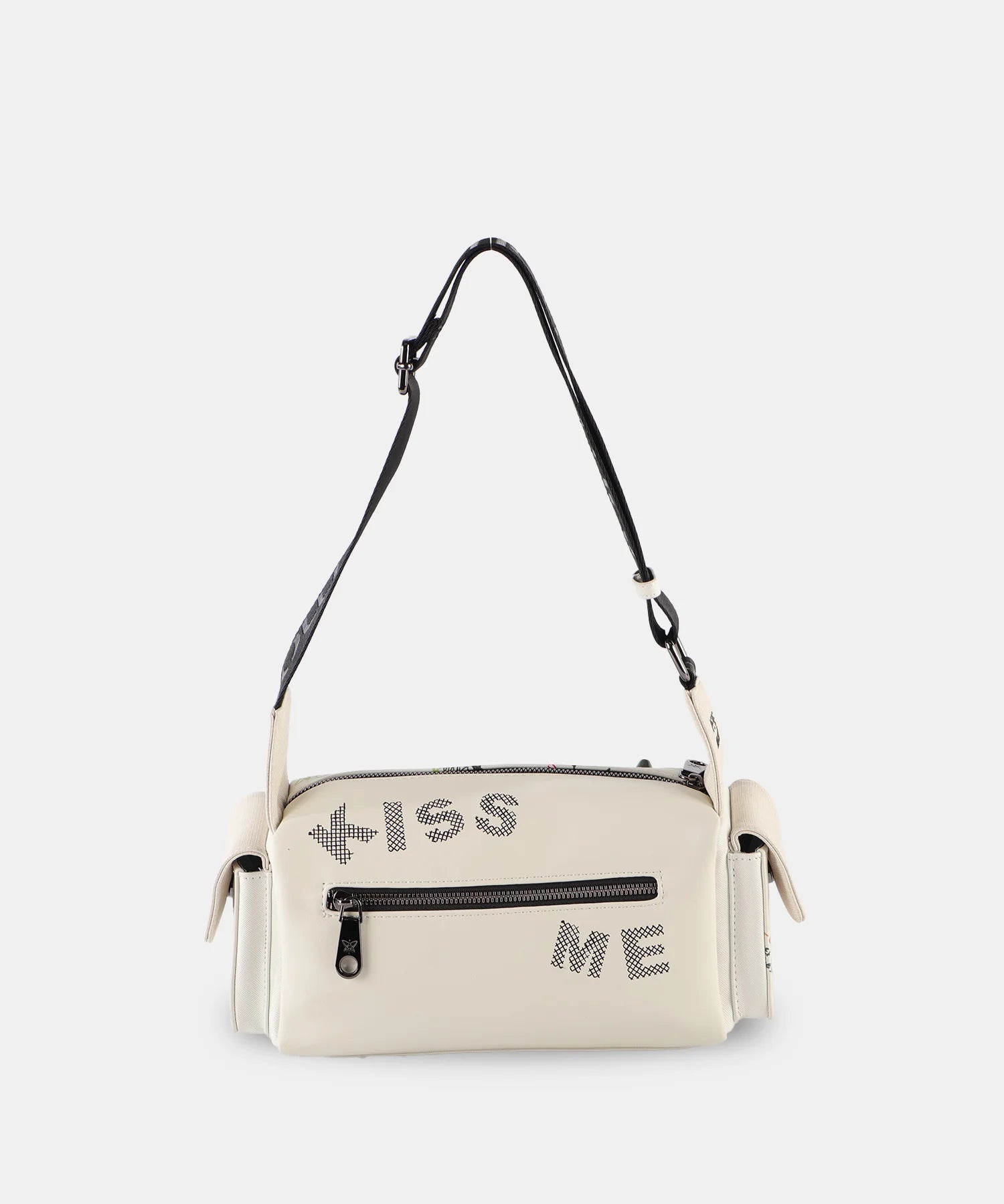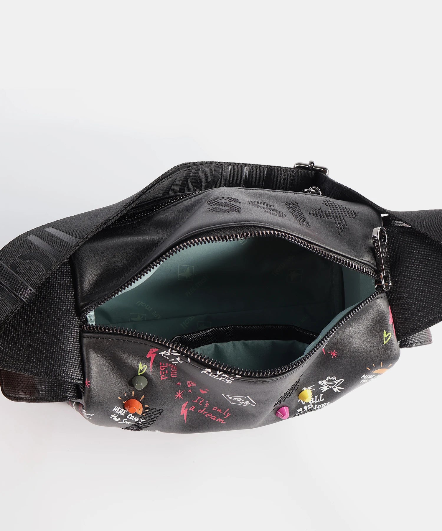Su silueta tipo baguette, alargada y estructurada, crea un look moderno y urbano. Y su mezcla de gráficos, mensajes y detalles convierte cada lado del bolso en una declaración de estilo.